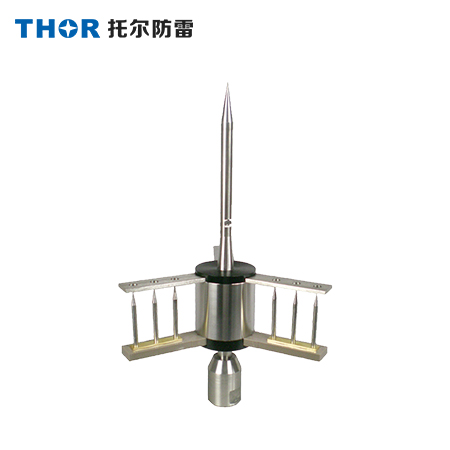 提前預放避雷針的激發(fā)器與反射器和中央收集桿是絕緣的。激發(fā)器和反射器有特殊的尖端結構,激發(fā)器從自然界的電場中吸收并貯存能量。反射器與避雷針先與大地良好相接,電位相同。通常情況下,激發(fā)器與反射器之間有一定的電磁場強度。雷電接閃前,避雷針在靜電感應作用下,避雷針上的異種電荷迅速增多,電場強度迅速增強激發(fā)器與反射器之間的電壓迅速增加,尖端打火擊穿周圍的空氣。